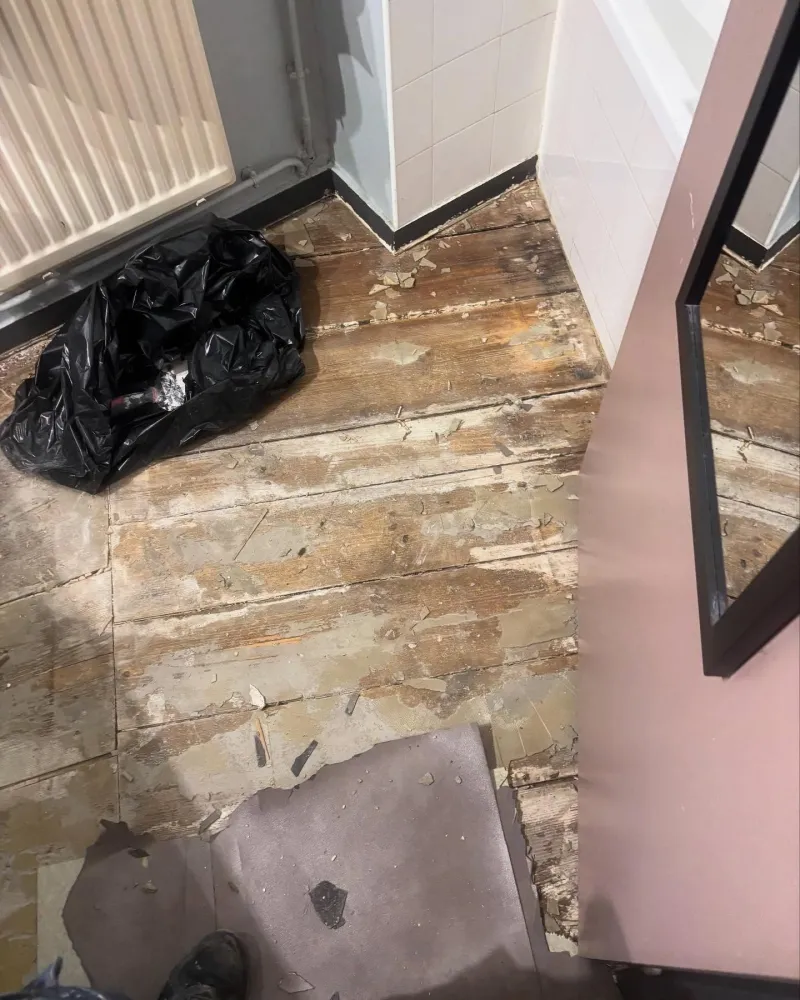 - Remise en état du support : le sol a été assaini et préparé afin d’accueillir un nouveau revêtement adapté aux contraintes d’une salle de bain.