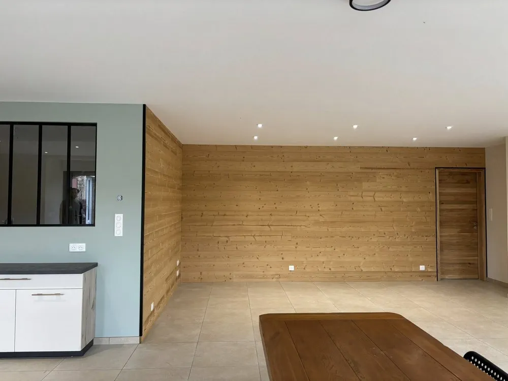 - Pose de bardage bois en finition décorative, apportant une ambiance chaleureuse à l’espace.
